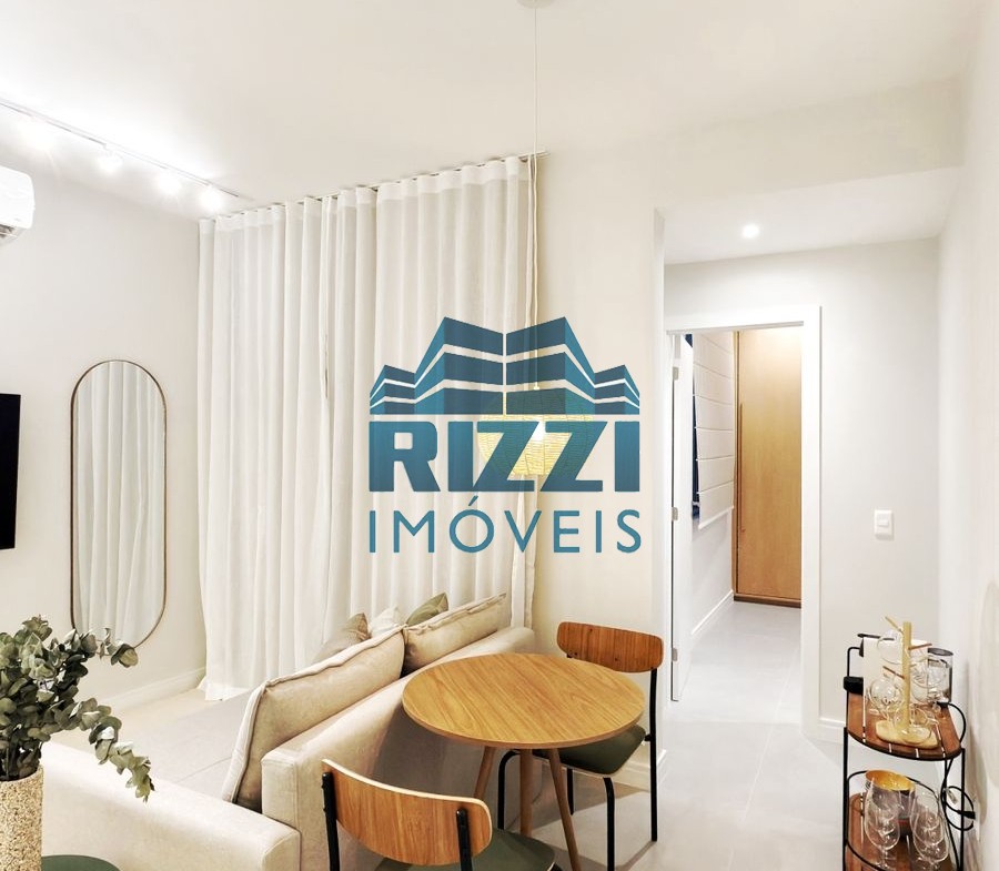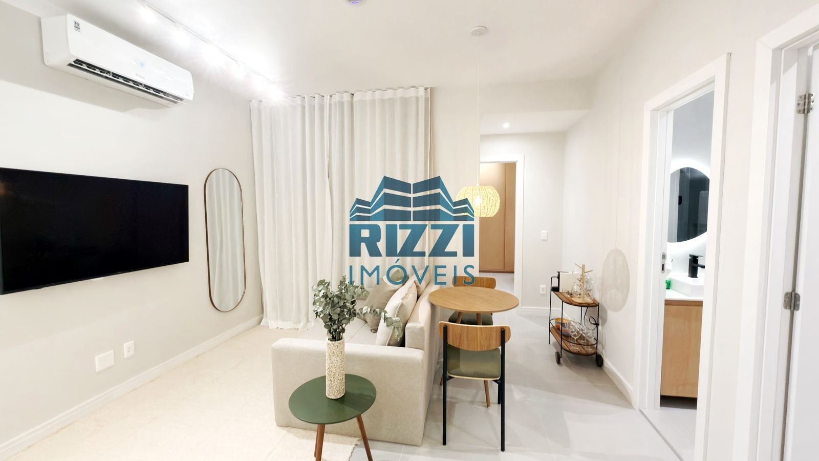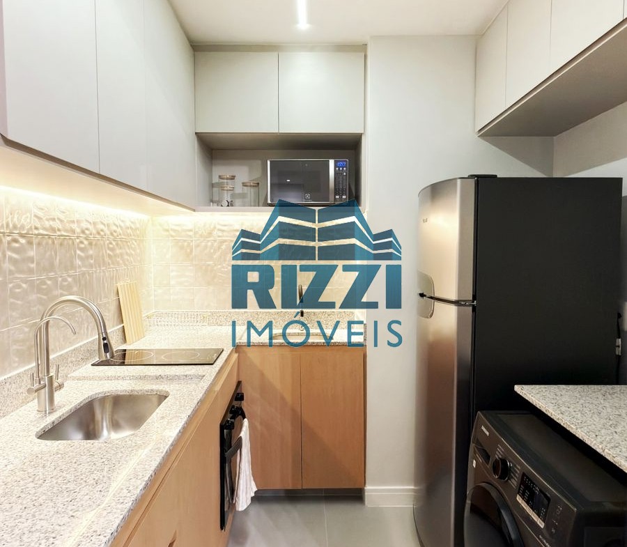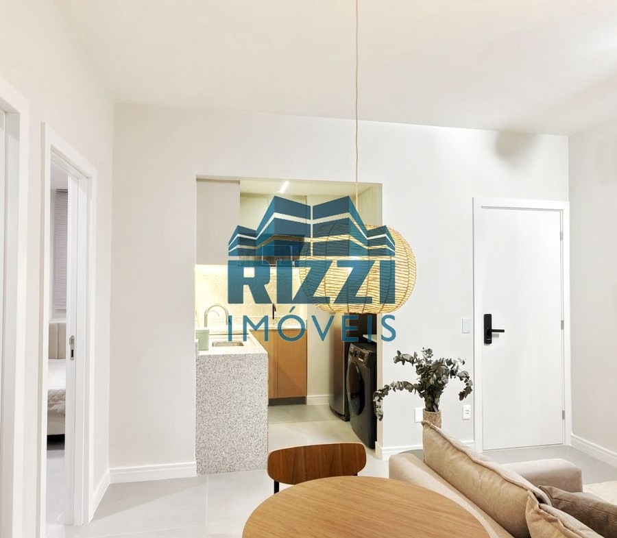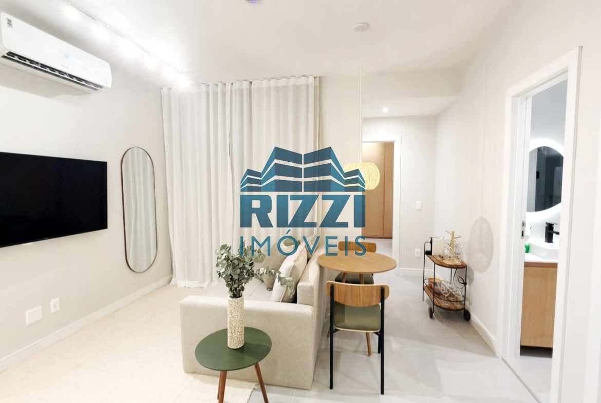 Camas de casal nos dois quartos, sofá-cama na sala, mesa de jantar, mesa de canto, cadeiras, cabeceiras, escrivaninha, Smart TV 55”, geladeira, micro-ondas, forno, cooktop, máquina de café, lava e seca, cortinas de linho, cortina black-out, espelhos, quadros, tapetes, utensílios domésticos, enxoval 400 fios, toalhas e outros itens.